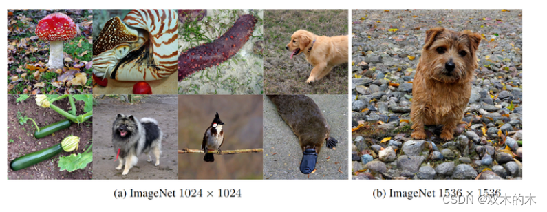 可以使用在 512×512 ImageNet 上训练的模型直接生成 1024×1024 和 1536×1536 图像。如图7所示,即使分辨率增加到训练的3倍,本文模型仍然能够生成具有上采样引导的视觉上吸引人的图像。