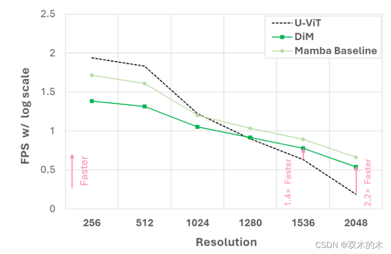 作者在图5中展示了本文模型,U-ViT 和 Mamba Baseline 的推理速度。这些模型具有相似的参数量 (0.9B) 和相同的 2×2 Patch Size。可以看到,原始的 Mamba 基线和 DiM 在分辨率低于 1024×1024 的情况下比优化良好的基于 Transformer 的模型慢。然而,在分辨率高于 1280×1280 情况下,DiM 比 Transformer 更快,这要归功于其线性复杂度。