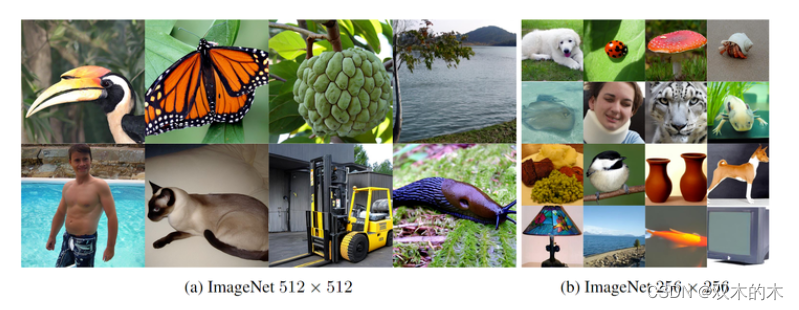 图1:本文模型在 ImageNet 上训练的图像生成的图像。分辨率分别为 1024×1024,512×512 和 256×256,classifier-free guidance 权重为 4.0