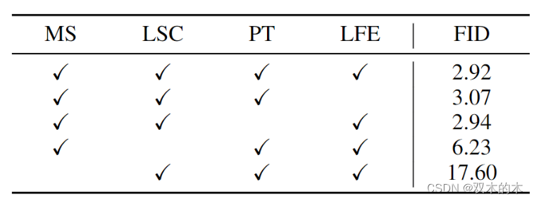 作者在 CIFAR-10 数据集上进行了消融实验,FIDs 结果如图11所示。其中第一行包含最佳性能模型的结果,其他行的性能对应于没有某些组件的模型。