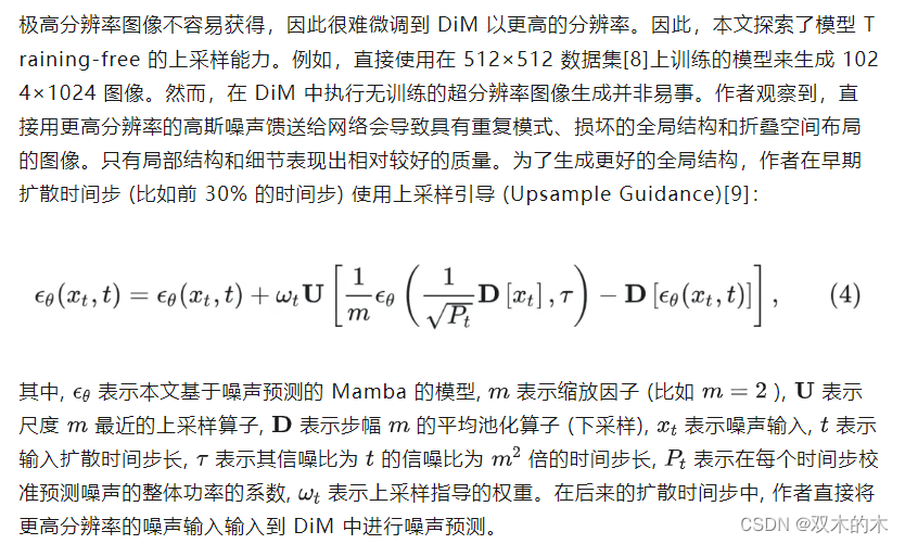 为了解决 DiM 高分辨率图像生成训练效率的挑战,作者探索了资源高效的方法,使得在低分辨率图像上预训练的 DiM 模型可以完成高分辨率的图像生成。作者首先观察到在低分辨率图像上预训练的 DiM 可以为高分辨率图像生成提供合理的先验。因此,作者探索了 "weak-to-strong" 训练策略[7]。作者首先在低分辨率图像上训练 DiM,然后使用预训练模型作为初始化来有效地微调高分辨率图像。该策略大大降低了高分辨率图像生成的训练时间成本。作者还探索了 training-free 的上采样方法,使 DiM 进一步适应更高分辨率的图像,而无需进一步微调。