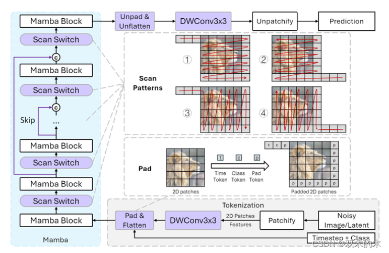 为了缓解第一个挑战,本文作者提出了 Diffusion Mamba (DiM),如下图 2 所示,这是一种基于 Mamba 的扩散模型 Backbone,用于高效的高分辨率图像生成。在 DiM 中,作者遵循 Diffusion Transformer 的做法将图像编码为 Patch 特征。然后,作者使用 Mamba 架构作为 Backbone 来建模特征。为了避免补丁之间的单向因果关系并赋予每个 token 全局感受野,作者设计了 Mamba Block 交替执行四个扫描方向。此外,作者在扫描顺序相邻的两个标记之间插入 learnable padding tokens,但在空间域中不相邻,从而允许 Mamba 块识别图像边界并避免误导序列模型。作者还将 3×3 Depth-Wise Convolution 添加到网络的输入层和输出层,以增强生成图像的局部相干性。此外,作者在浅层和深层之间添加了长跳跃连接[1][3]。基于 Transfo,以将低级信息传播到高级特征,这一点已经被证明有利于扩散模型中的像素级预测目标。