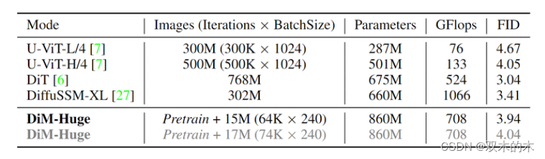 评价指标为 FID-50K[11],数据集为 CIFAR 和 ImageNet。作者还使用 classifier-free guidance 进行评估,计算 FID 的指导权重与 U-ViT 中的指导权重相同。考虑到有限的 GPU 资源,在 ImageNet 256×256 上进行预训练时,将 DiM-Large 和 DiM-Huge 的 Batch Size 设置为 1024 和 768。在 ImageNet 512 × 512 上微调 DiM-Huge 时,将 Batch Size 设置为 240,梯度累积。