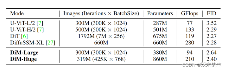 考虑到有限的计算资源和时间,作者只能在最多 319 million 图像样本上训练模型。作者将 DiM 与其他基于 Transformer 和 SSM 的扩散模型进行了比较,如下图8所示。值得注意的是,在对 319 million 个图像样本进行训练后,DiM-Huge 在 FID-50K 上可以达到 2.40 的分数。在使用 U-ViT (319M vs 500M) 63% 的训练数据的情况下,本文模型的性能与其他基于 Transformer 的扩散模型相当,即在 FID-50K 上仅差约 0.1。此外,与 DiffuSSM-XL 相比,基于 Mamba 的扩散模型的 GFLOPs 要小得多,即 DiM 需要更少的资源进行推理。