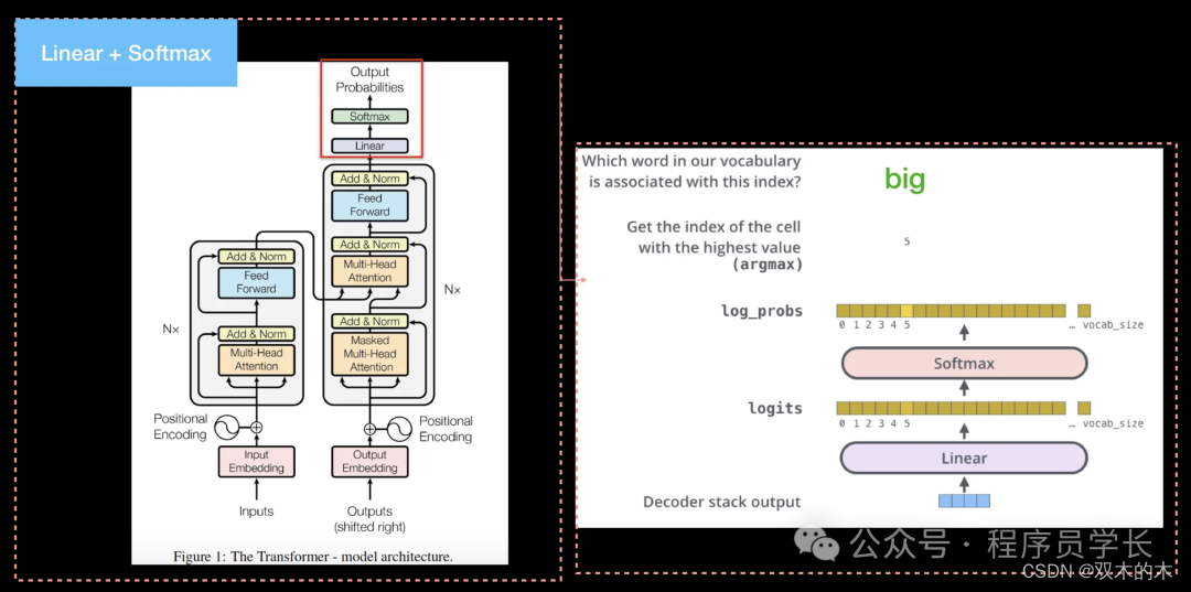 线性层就是一个普通的全连接神经网络,可以把解码器输出的向量,映射到一个更大的向量,这个向量称为 logits 向量。假设我们的模型有 10000 个英语单词(模型的输出词汇表),此 logits 向量便会有 10000 个数字,每个数表示一个单词的分数。