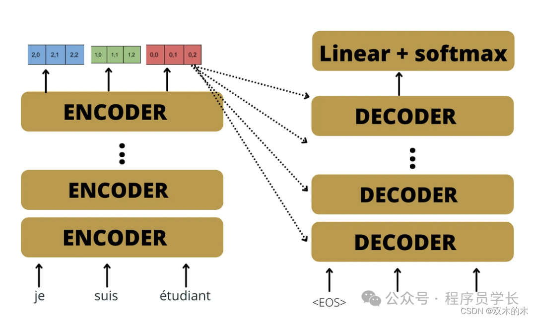 编码器一般有多层,第一个编码器的输入是一个序列文本,最后一个编码器输出是一组序列向量,这组序列向量会作为解码器的 K、V 输入,其中 K=V=解码器输出的序列向量表示。这些注意力向量将会输入到每个解码器的 Encoder-Decoder Attention 层,这有助于解码器把注意力集中到输入序列的合适位置,如下图所示。