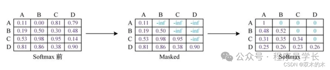 例如在 “我看到 ______ 追着一只老鼠” 中,我们会直观地填充猫,因为这是最有可能的。因此,在编码单词时,它需要知道整个句子中的所有内容。这就是为什么在自注意力层中,查询是针对所有单词执行的。但是在解码时,当试图预测句子中的下一个单词时,从逻辑上讲,它不应该知道我们试图预测的单词之后有哪些单词。因此需要使用掩码(Mask)机制来屏蔽掉未来位置的信息。