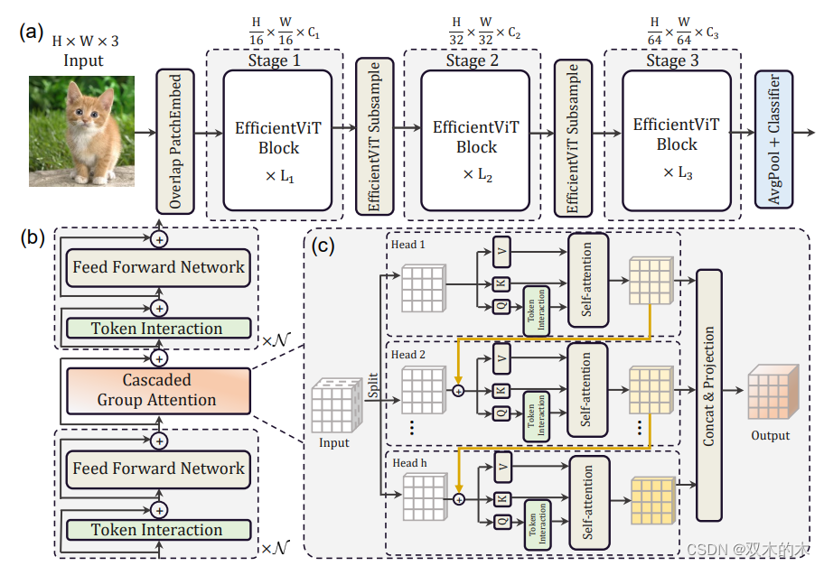 基于这些分析和发现,研究者提出了一个新的存储器高效transformer模型家族,命名为EfficientViT。具体来说,设计了一个带有三明治布局的新块来构建模型。三明治布局块在FFN层之间应用单个存储器绑定的MHSA层。它减少了MHSA中内存绑定操作造成的时间成本,并应用了更多的FFN层来允许不同信道之间的通信,这更具内存效率。然后,提出了一种新的级联群注意力(CGA)模块来提高计算效率。其核心思想是增强输入注意力头部的特征的多样性。与之前对所有头部使用相同特征的自我注意不同,CGA为每个头部提供不同的输入分割,并将输出特征级联到头部之间。该模块不仅减少了多头关注中的计算冗余,而且通过增加网络深度来提高模型容量。