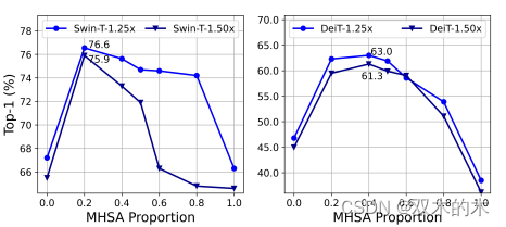 在这项工作中,研究者转而通过减少内存低效层来节省内存访问成本。最近的研究表明,内存低效操作主要位于MHSA层,而不是FFN层。然而,大多数现有的ViT使用相等数量的这两层,这可能无法实现最佳效率。因此,研究者探索了在具有快速推理的小模型中MHSA和FFN层的最优分配。具体而言,将Swin-T和DeiT-T缩减为几个推理吞吐量分别高1.25倍和1.5倍的小型子网络,并比较不同MHSA层比例的子网络的性能。