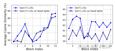 为了节省计算成本,探讨如何减少小型ViT模型中的冗余注意力。以1.25×推理加速训练宽度缩小的Swin-T和DeiT-T模型,并测量每个头部和每个块内剩余头部的最大余弦相似性。从下图中,观察到注意力头部之间存在高度相似性,尤其是在最后一个块中。