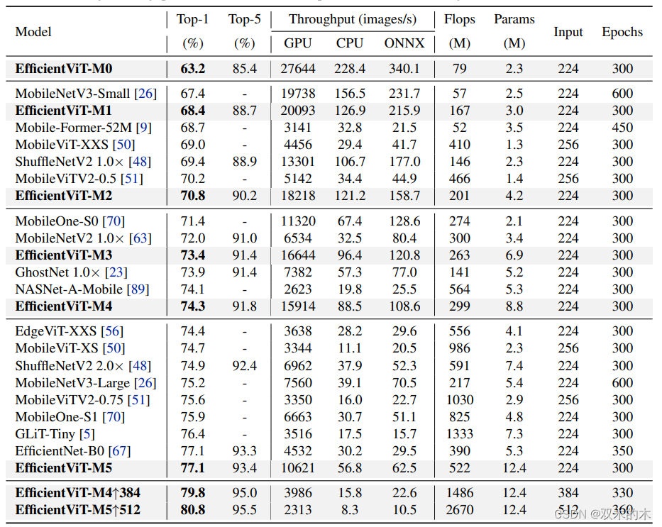 综合实验表明,EfficientViT优于现有的高效模型,在速度和准确性之间取得了良好的平衡。例如,EfficientViT-M5在精度上超过MobileNetV3 Large 1.9%,而在Nvidia V100 GPU和Intel Xeon CPU上的吞吐量分别高出40.4%和45.2%。与最近的高效型号MobileViT XXS相比,EfficientViT-M2实现了1.8%的卓越精度,同时在GPU/CPU上运行速度快5.8倍/3.7倍,转换为ONNX格式时速度快7.4倍。