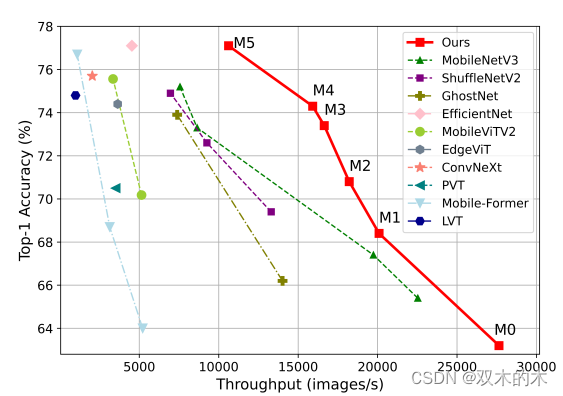 最近有几项工作设计了轻便高效的Vision transformers模型。不幸的是,这些方法大多旨在减少模型参数或Flops,这是速度的间接指标,不能反映模型的实际推理吞吐量。例如,在Nvidia V100 GPU上,使用700M浮点的MobileViT XS比使用1220M浮点的DeiT-T运行得慢得多。尽管这些方法以较少的Flops或参数获得了良好的性能,但与标准同构或分级transformer(例如DeiT和Swin)相比,它们中的许多方法并没有显示出显著的壁时钟加速,并且没有得到广泛采用。