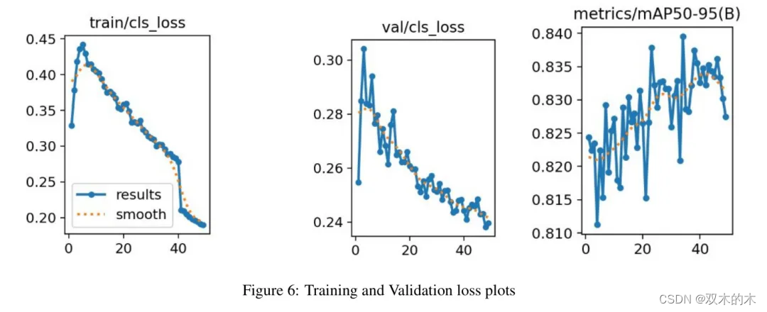 这意味着其预测与真实情况之间的误差随时间减少。平均精度(mAP)是用于评估目标检测模型的指标。它权衡了精确度和召回率,同时考虑了假阳性和假阴性。这一特性使得mAP成为大多数检测应用中合适的指标。如图**??**所示,在整个训练过程中,尽管偶尔有波动,mAP仍有明显且一致的上升。