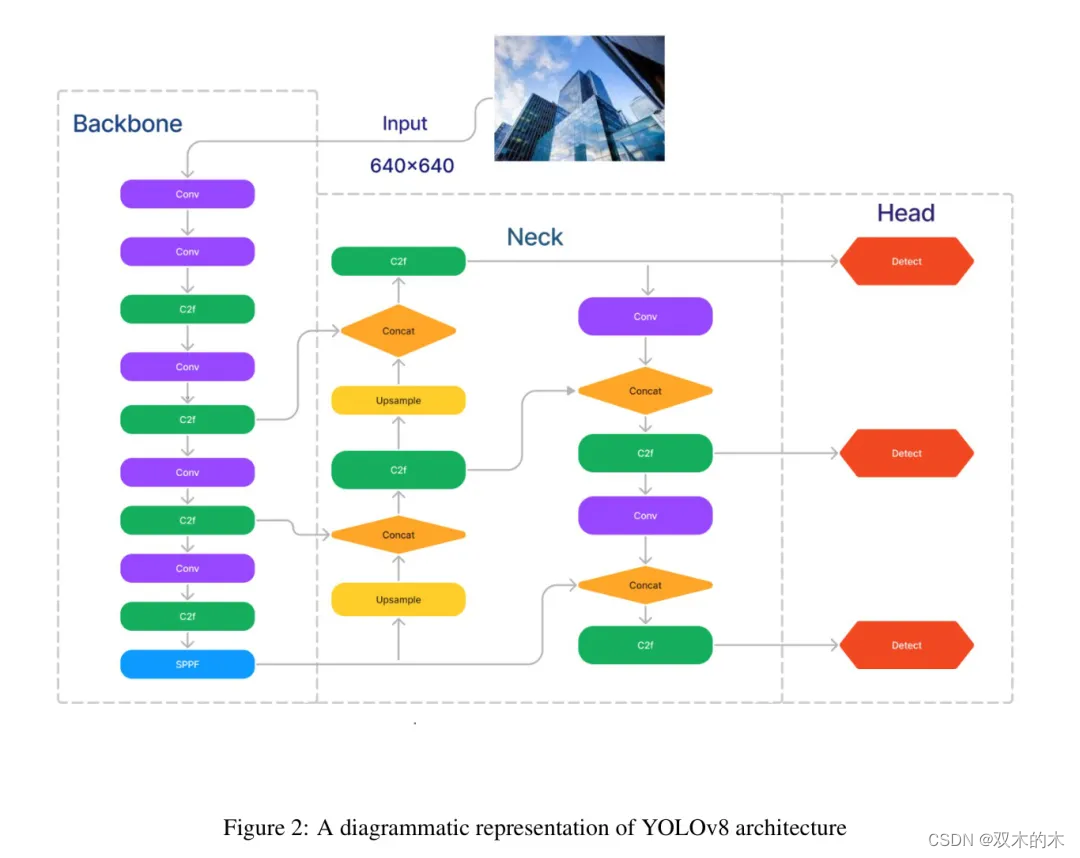它使用softmax函数来表示属于每个可能类别的物品的概率。YOLOv8使用CIoU[68]和DFL[108]损失函数进行边界框损失,以及用于分类损失的二元交叉熵。这些损失提高了目标检测性能,特别是在小物体方面。与典型的YOLO Neck 架构不同,主干网络是一个CSPDarknet53特征提取器,后面跟着一个C2f模块。在C2f模块之后是两个分割 Head ,它们学习预测输入图像的语义分割 Mask 。该模型具有与YOLOv8类似的检测 Head ,包括五个检测模块和一个预测层。YOLOv8-Seg模型在各种目标识别和语义分割基准测试中实现了尖端性能,同时保持了快速和高效。