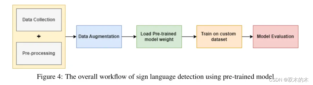 为了保持更好的准确性,作者为项目开发了一个特定的数据集。通过以60 fps和4k分辨率录制视频,从20个不同的人那里收集了20个手势。每个手势大约包含300帧,整个数据集由5900个数据点组成。在预处理阶段,将图像调整为432 x 256像素,以减小数据集的大小,从而使得计算更加容易。数据增强是深度学习中使用的一种技术,用于提高训练模型所使用的数据质量。它通过对现有数据样本添加小变化来实现这一点。