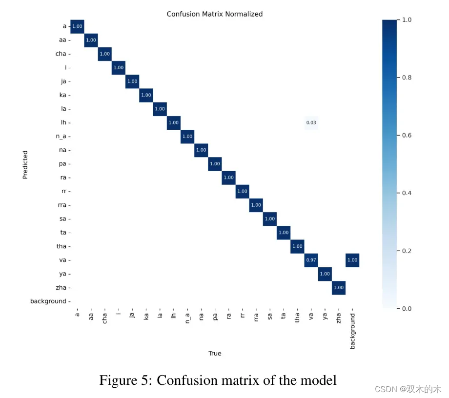 预测类别在垂直轴上,而真实情况沿水平轴。可以观察到,除了“va”类别的值为0.97外,大多数类别都被YOLOv8正确分类。在热力图中,从左上角到右下角的对角线单元格代表正确的预测。