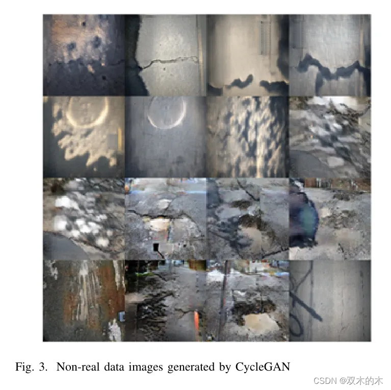 本文中包含三种图像数据,如裂缝、坑洞和修补区域,使用CycleGAN可以生成现有数据中不常见或未涵盖的图像变体,例如不同大小、形状或严重程度的检测目标。这可以进一步增强数据的多样性,以训练更鲁棒的模型。对于自然收集的数据集中罕见的特殊道路损害情况(例如,大裂缝或坑洞数据),CycleGAN也可以用来补充类似极端情况的图像,从而帮助模型学习识别和处理这种虽不常见但重要的情景。
