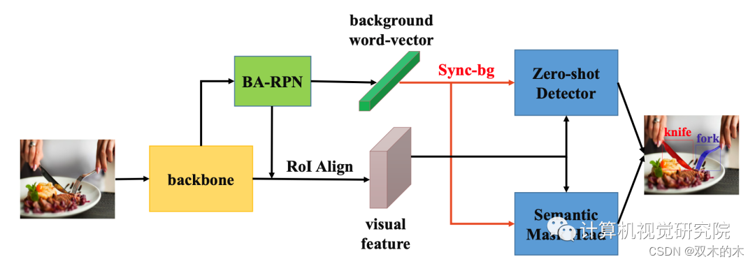 整个零样本实例分割的框架如下图所示。对于一张输入图像来讲,首先要使用骨干网络(backbone),BA-RPN和ROI Align来提取视觉特征和背景的词向量,然后经过Sync-bg模块后分别送入零样本检测器和语义分割头,从而得到实例分割的结果。