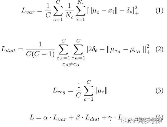 (1)拉力。惩罚同一实例中所有元素与其平均值之间的距离。也就是说,获取一个实例的所有像素,并计算平均值。这种拉力会将同一实例中的所有像素点拉近到嵌入空间中的同一个点。简单说,就是减少每一个实例的嵌入方差。