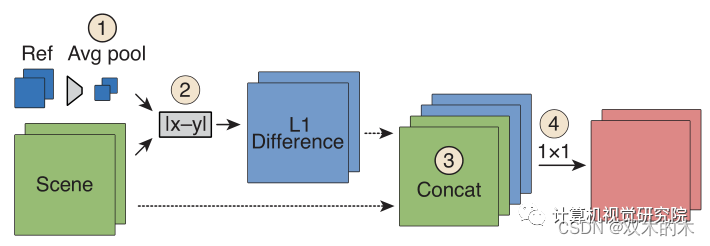 主要的4处不同已经用红色标识,即R、Siamese、Matching、L1。R代表了输入不仅有Query Image还有Reference Image;SiameseNetwork则对两者分别进行encode;Matching是将编码后的2个feature vector进行逐一的匹配;L1则是算diff的手段。具体的匹配流程如下图。