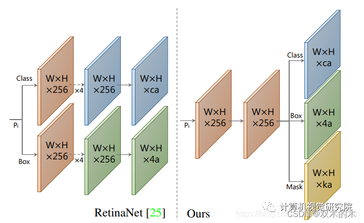 (3)Prediction Head:相比RetinaNet的Head,多了一个Mask Cofficient分支,预测Mask系数,因此输出是4*c+k。