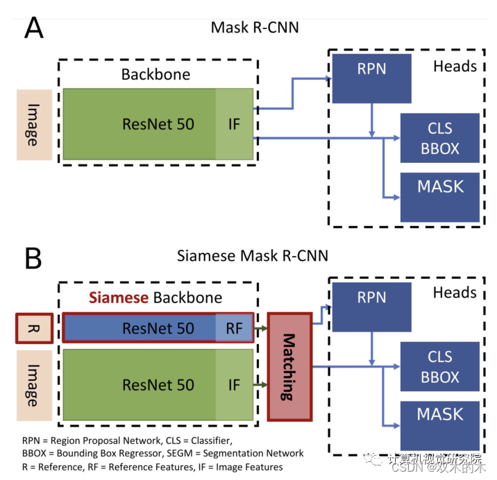 正如名字一样,主体框架就是由SiameseNetwork + Mask R-CNN。改进前后的框架比对如下图。