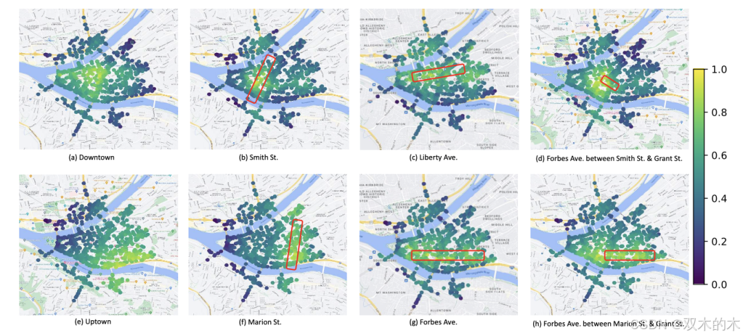 通过给定不同精细程度的地址文本的查询(如街区,街道,子街道),模型都可以在测试集图像上展示出与其真实覆盖地理分布一致的激活。