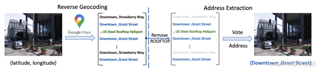 接着,通过筛选、投票等数据清洗机制,可以过滤得到每个图像的街道级地址文本。