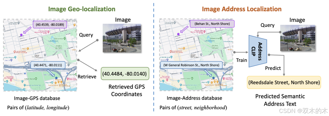 本篇工作提出了更加用户友好的,端到端的图像地理定位任务。二者的对比示意图如下:
