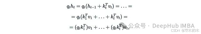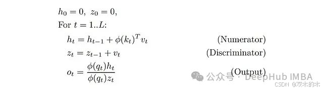 这是在2020年ICML上首次提出线性化注意力的论文"Transformers are RNNs"。在这个公式中,我们有两个隐藏状态:向量z_t和矩阵h_t(φ(k_t)^T v_t是列向量乘以行向量,得到一个d×d矩阵。