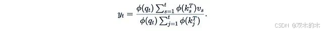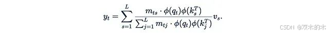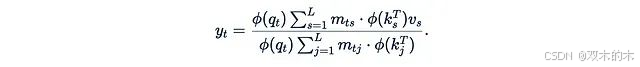 这个简化后的公式存在一个问题:q_t^T k_s不能保证为正,这可能导致值以不同符号的系数混合,这在理论上是不合理的。更糟糕的是,分母可能为零,会导致计算崩溃。为了缓解这个问题,我们可以引入一个"良好的"元素级函数φ(称为核函数):