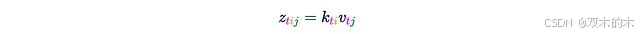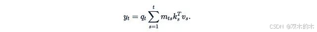 最后,将注意力权重矩阵A与值矩阵V相乘。输出的第t行可表示为: