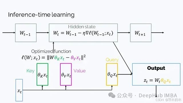 2、Learning to (learn at test time) (2024年7月): 这是另一种具有矩阵隐藏状态的RNN架构,它的隐藏状态W是一个函数的参数,在t的迭代过程中通过梯度下降优化: