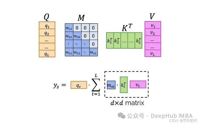 解决这个问题的关键在于我们不能使用任意的掩码M,而应该选择特殊的、"良好"的掩码。我们需要那些可以快速与其他矩阵相乘(注意不是元素级乘法)的掩码。为了理解如何从这种特性中获益,让我们详细分析如何高效计算: