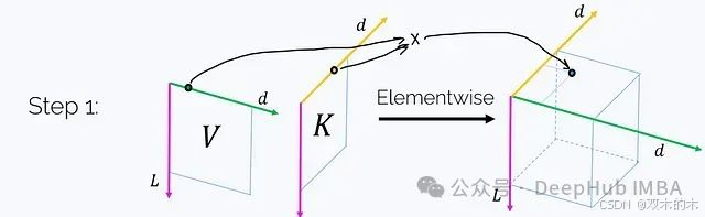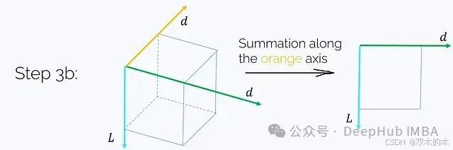 (每个轴都标注了其长度。)这一步骤需要O(Ld²)的时间和内存复杂度。值得注意的是,如果我们在洋红色轴t上对这个张量求和,我们将得到矩阵乘积K^T V: