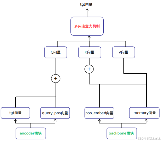 由上节可知,backbone模块和位置编码的模块维度相同,因此对两者的输出相加得到transformer编码模块的Q和K向量。