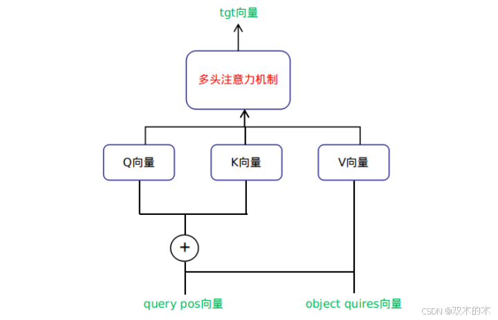 第一个自注意机制的Q向量和K向量是object quires向量与对应位置编码模块query_pos向量相加,V向量则是object quires向量。流程如下图: