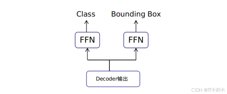 前馈神经网络模块对transformer结构输出后的数据完成分类+bbox预测任务,两个FFN共享transformer的输出。