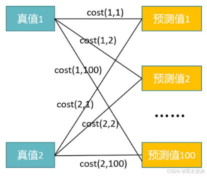 匈牙利算法依据匹配的总损失值最小的原理,得到预测框和真实框的匹配项。
