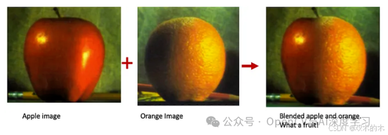 如果您想要将两张图像混合成半个苹果、半个橙子的图像,那么您可以取苹果的左半部分并将其与橙子的右半部分并排组合在一起。
