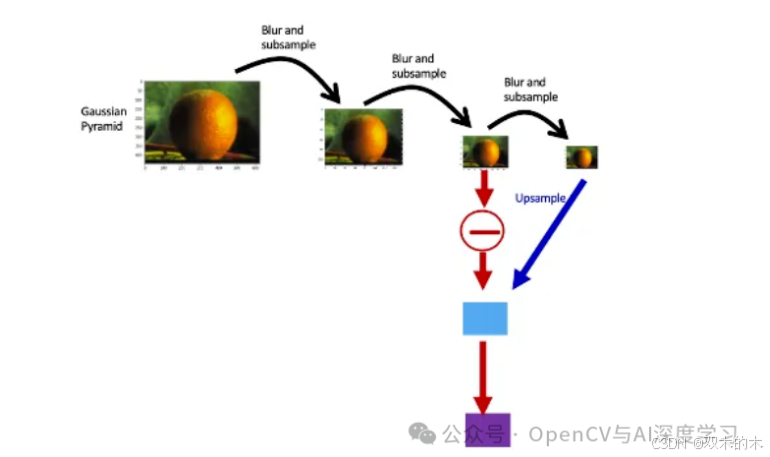 为了对较小的图像进行上采样,我们使用插值进行上采样,即先上采样再进行滤波。以 2 倍的倍数进行上采样会在原始图像的每个像素之间插入 1 个零。然后我们使用高斯滤波器对该图像进行低通滤波,以消除上采样插入的图像伪影和异常。然后,我们从高斯金字塔中当前比例的图像中减去上采样后的图像(蓝色框)。这些图像在上采样后将具有相同的大小,结果就是当前比例的拉普拉斯算子。
