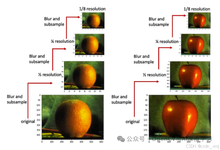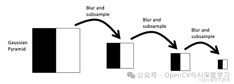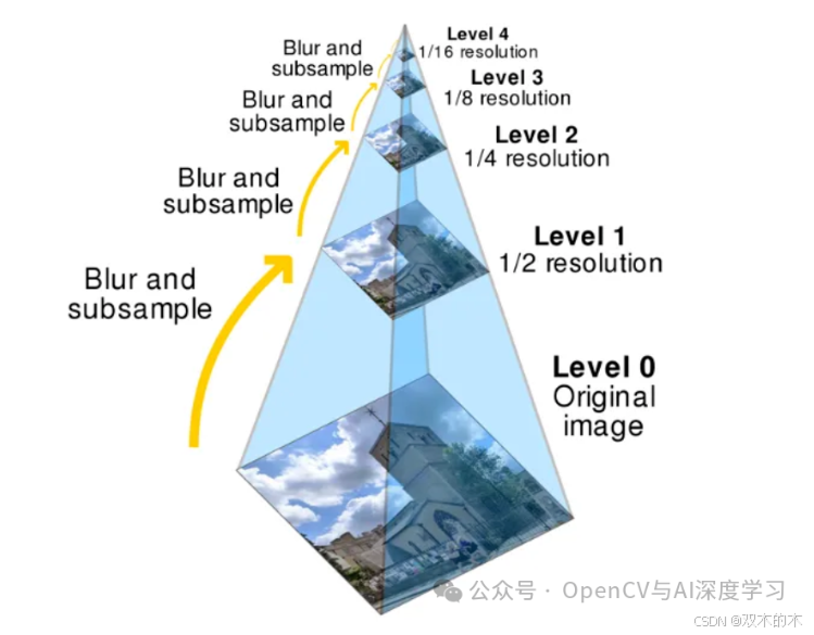 使用高斯金字塔,在每个尺度上,图像尺寸减小 2 倍,而所应用的聚合高斯平滑滤波器的尺度增加 2 倍。简单地说,金字塔的每一层,图像都会变得更小、更模糊。