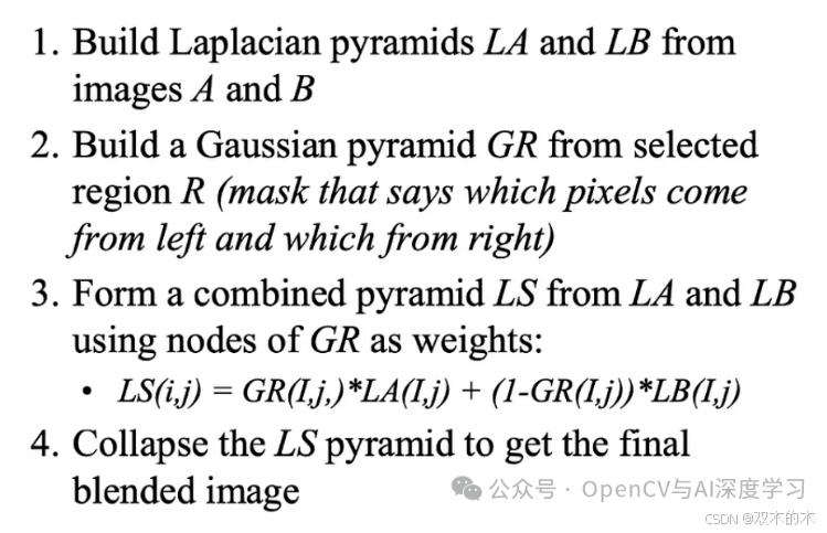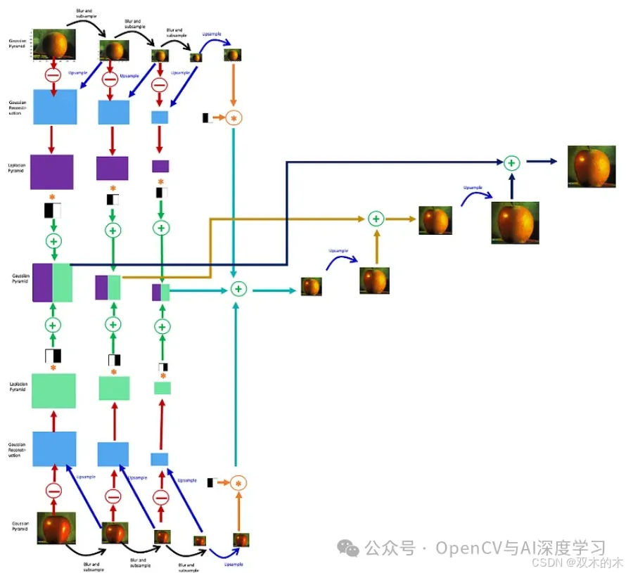 将高斯滤波器应用于子采样蒙版可使图像混合变得平滑。蒙版有助于我们将两个输入的拉普拉斯金字塔组合起来。使用 alpha+(1-alpha) 组合,在每个尺度上,我们将蒙版乘以图像 A 的拉普拉斯,然后将图像 B 的拉普拉斯乘以 (1-mask) 并将两者相加。