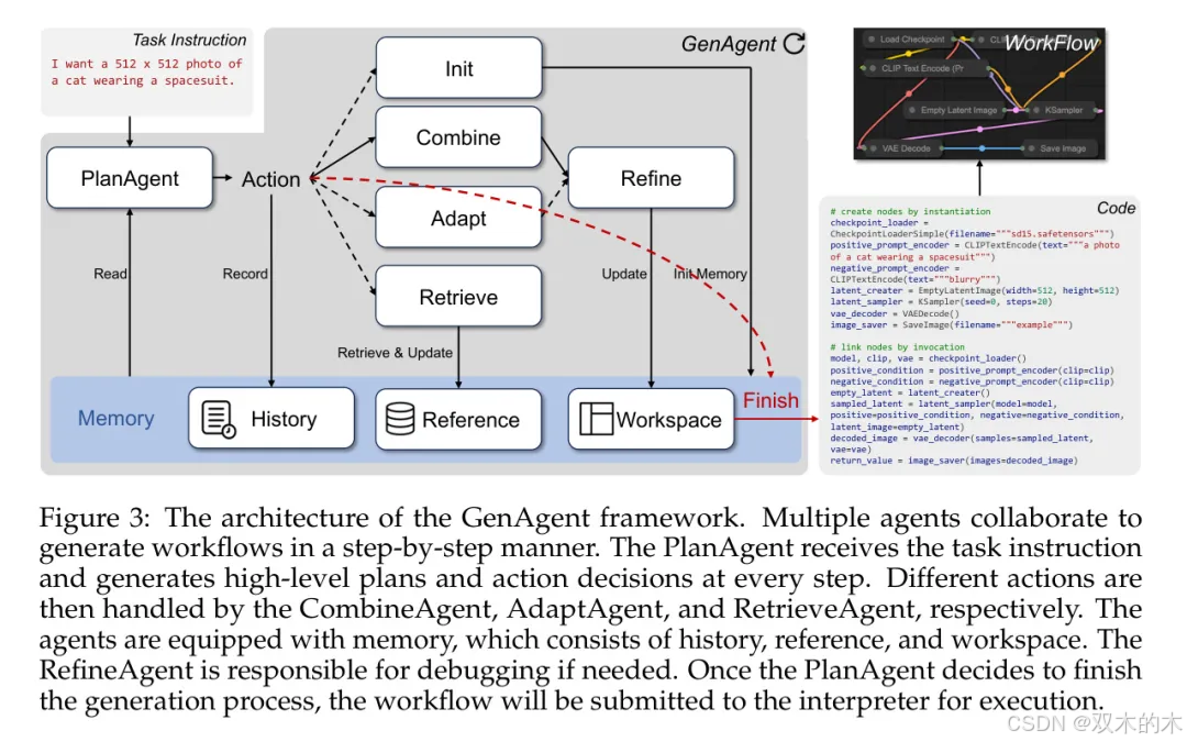 图3:GenAgent框架的架构。多个代理按顺序协作,以逐步生成工作流。PlanAgent接收任务指令,在每一步生成高级计划和行动决策。CombineAgent、AdaptAgent和RetrieveAgent分别处理不同的操作。代理配备了记忆,包括历史、引用和工作空间。RefineAgent在必要时负责调试。一旦PlanAgent决定结束生成过程,工作流将被提交给解释器执行。