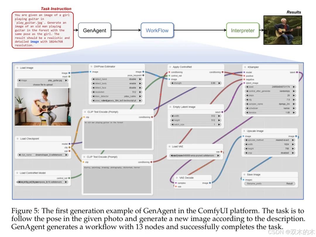 图5 展示了第一个生成示例。该任务提供一个女孩弹吉他的照片,需要生成一个老年人在森林中弹吉他的图像,其姿态与女孩相同。此外,任务要求指定预期的风格和分辨率。在技术上,一种可能的解决方案是使用姿势估计器与 ControlNet 模型将姿态信息注入作为条件。实际上,GenAgent 学会了这些技术并生成了一个简单的 13 个节点的流程。最终生成的图像通过执行 ConfyUI 中的流程来生成,在参数和语义上都满足了任务要求。