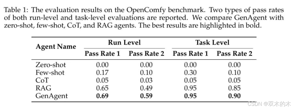 所有代理在3.2节中以代码表示的工作流程。作者计算了两种类型的通过率作为指标。第一种是通过率发生在将代码解析为JSON格式时,反映生成的代码是否具有语法正确性。然后解析的工作流将在ComfyUI中执行,通过第二种通过率反映工作流是否逻辑正确且可以成功执行。这两种通过率不考虑最终结果的质量,但程度上揭示了代理生成工作流的有效性和稳定性。每个任务将进行5次评估,总共进行100次运行。除了运行 Level 的结果外,作者还计算了任务 Level 的结果,即如果任一运行成功,则认为任务通过。OpenComfy基准上的评估结果如表1所示。