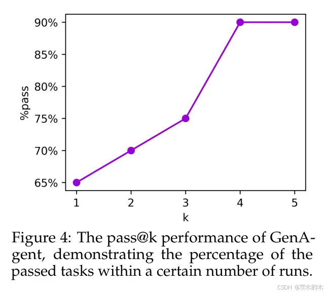 图4:展示了GenAgent的pass@k性能,即在多少次运行后成功完成的比例。