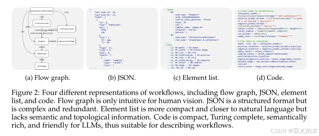 流程图是人工神经网络(NN)对工作流图表示的最直观且用户友好的方式之一,但不是对链式随机森林(LRF)的友好方式。”如图1(a)所示,流程图展示了ComfyUI(ComfyUI,2023)中的默认文本到图像工作流程,完全反映了ComfyUI前端如何与用户互动。然而,由于流程图本质上具有视觉性,它们很容易被标准LRF误解,因为它们无法解释视觉数据。尽管视觉语言模型(VLMs)可以阅读流程图,但由于其有限的视觉生成能力,它们在修改流程图方面存在困难。JSON是LRMs表示结构信息的一种流行方法,但对于工作流有向无环图(DAG)表示并不是很好的方法.**Zhang等人在(2023)中提出使用JSON来表示数据分析的某些简单工作流程。对于复杂的工作流程,作者的实验表明,LRM使用JSON理解并生成它存在很大的缺陷,如图表2所示。这种困难可能源于大型语言模型(LRM)无法完全理解由JSON编码的复杂有向无环图(DAG)关系。由于LRM通常具有有限的长度上下文,这个问题可能会进一步加剧。