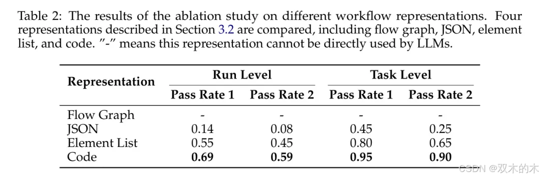 它们并没有明确显示流程图的拓扑顺序,这会导致LRM在工作流程变得相对复杂时理解与生成此格式的困难,如图表2所示。Li等人在(2024)中提出使用CoRE语言来表示工作流程,它可以被视为元素列表的文字版本。然而,CoRE语言并未解决元素列表固有的问题,并且需要对LRM进行额外的微调。