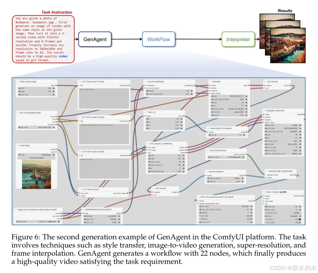 图6 展示了第二个生成示例。与第一个任务相比,该任务更为复杂,需要生成遵循给定布达佩斯风格的照片风格的伦敦图像,并将其转换为视频。考虑到模型受分辨率和平帧速率限制,该任务还需要进行上采样和插值以形成高质量视频。为了解决这个问题,GenAgent 生成了一个 22 个节点的流程和复杂的连接,并利用了多种模型,如 SVD、ESRGAN 和 RIFE。流程最后生成了一个具有预期内容和质量的视频。作者将在项目页面上展示所有完整的流程和相应的图像或视频。